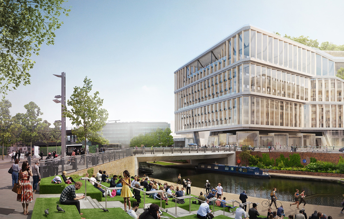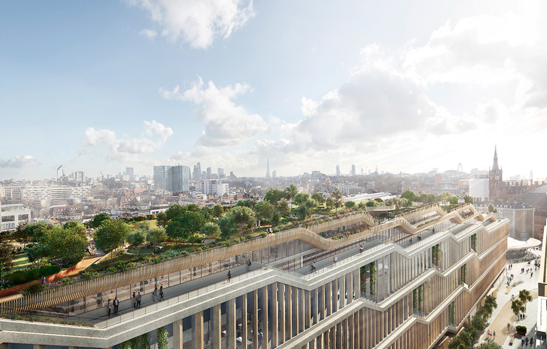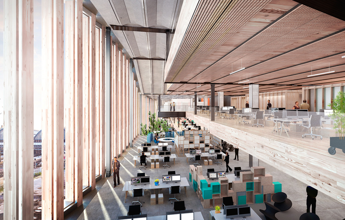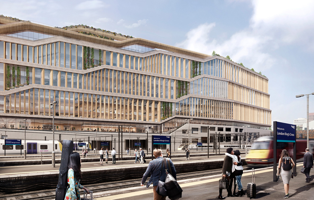 In the London district of King’s Cross, what will soon be the world’s largest wood façade is beginning to take shape. Behind the 23,300 square metre expanse, Google will have its new British headquarters, with space for 7,000 staff. The look of the façade is achieved through a repetitive sequence of accoya glulam posts in varying heights. The design language is modern, but with a clear connection to the other local architecture. The height of the terraced building varies between 20 and 60 metres, with the highest point 11 storeys up. The façade is divided into four sections, with the glulam posts creating a cohesive exterior. They are also a key part of the interior, as each post extends over several floors, creating a sense of volume. The office spaces feature mezzanine floors whose exposed CLT, with its soft, warm surface, contrasts with steel and concrete. A diagonal staircase will lead from the ground floor to the roof, which will be punctuated with green spaces, a running track and a pool.