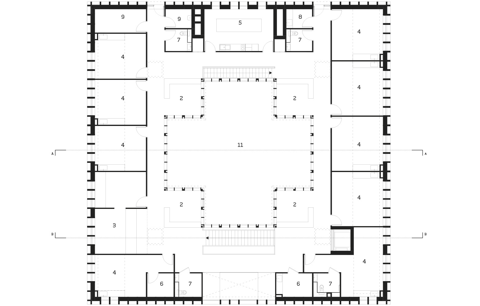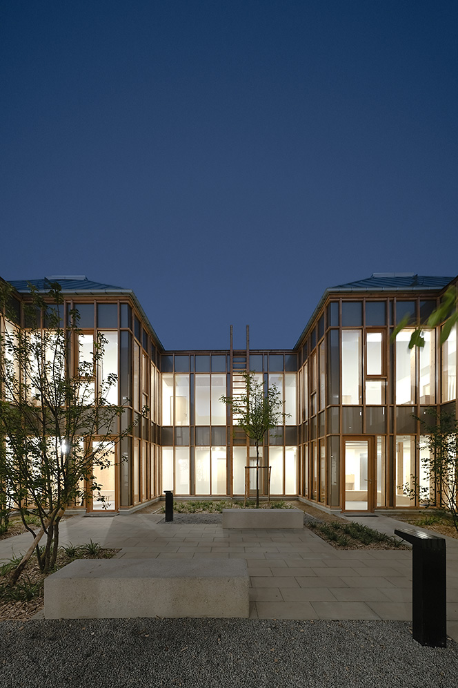 The architects began sketching out a square structure entirely in wood, enclosing an outdoor space at the centre. They took inspiration from ancient monasteries and organised the interior spaces to make the most of this courtyard.