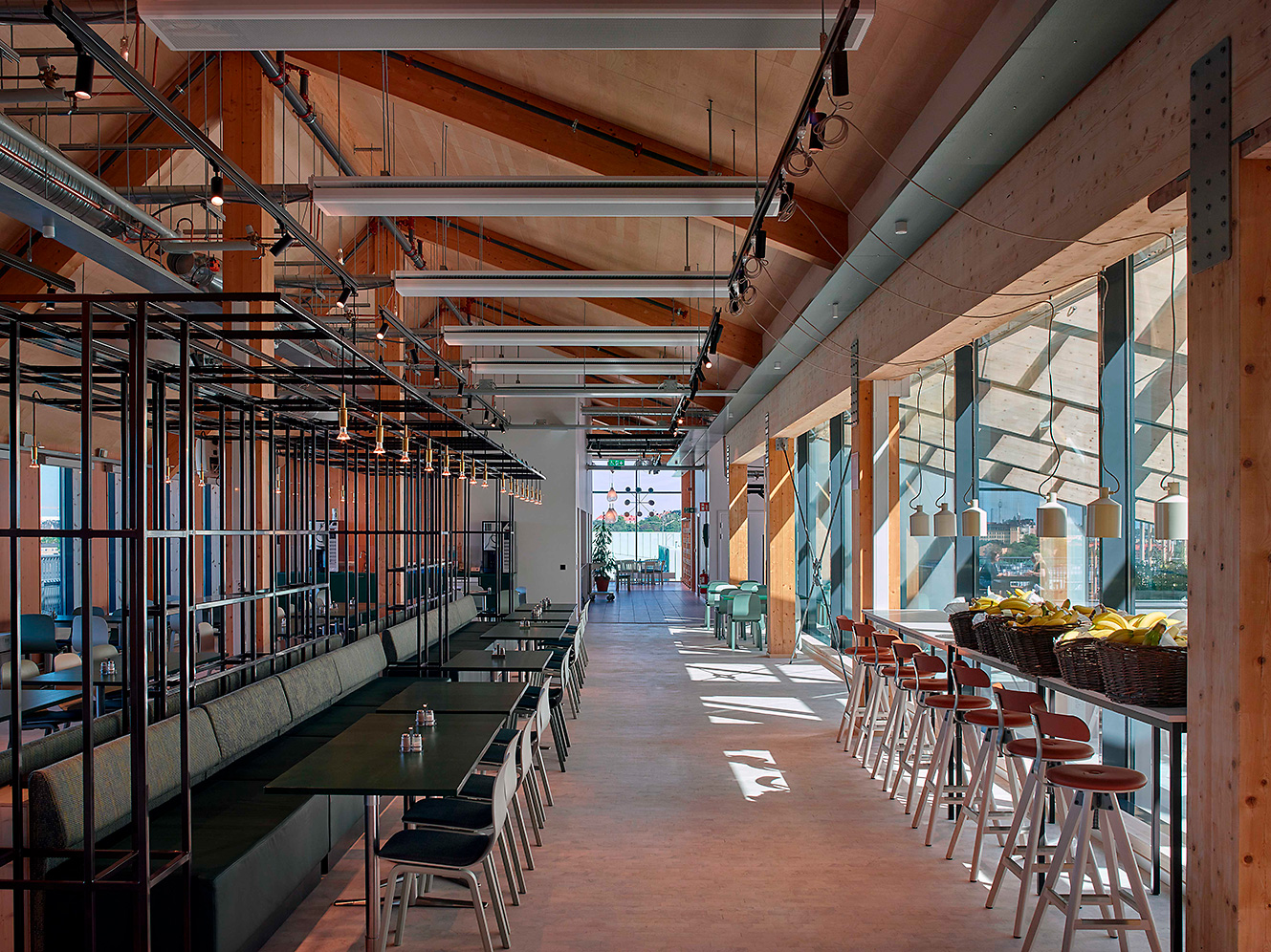Wood is a prominent feature of Trikåfabriken and the load-bearing frame is part of the design. The material highlights an honest approach to design, where nothing is concealed. The ambition was to make it as clear as possible where old meets new, which is why the wood frame is exposed internally and visible from outside.
