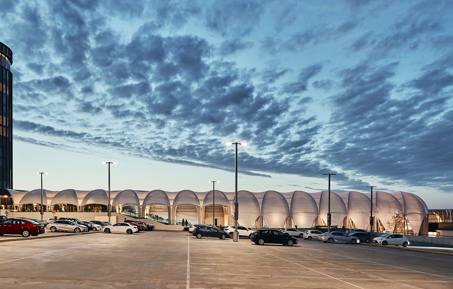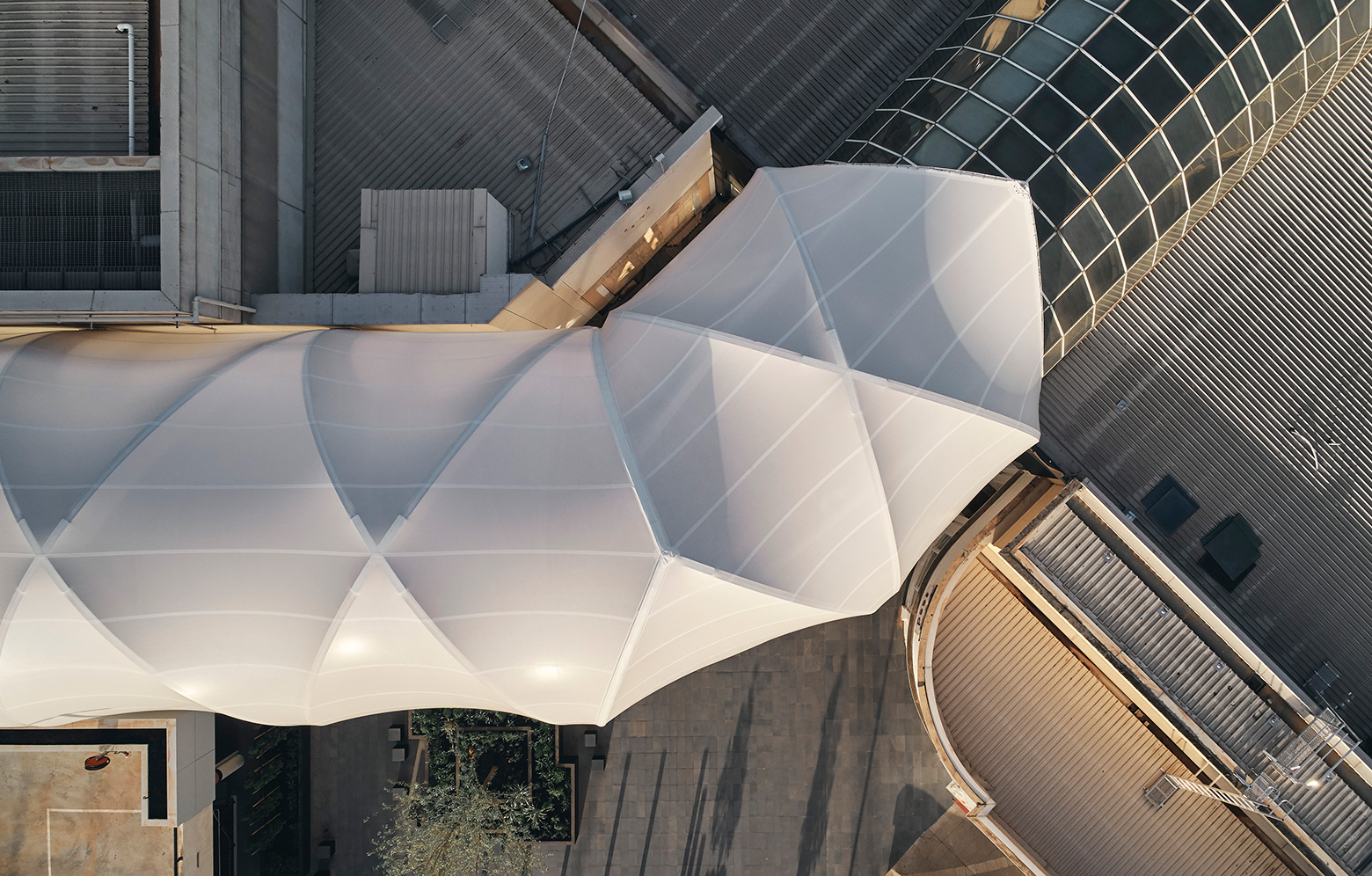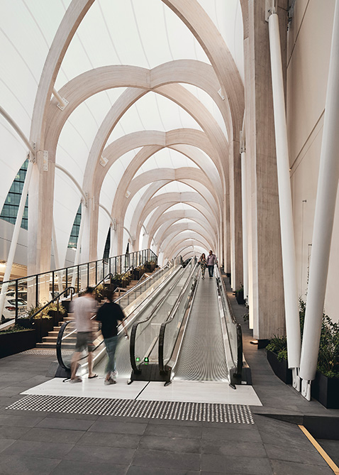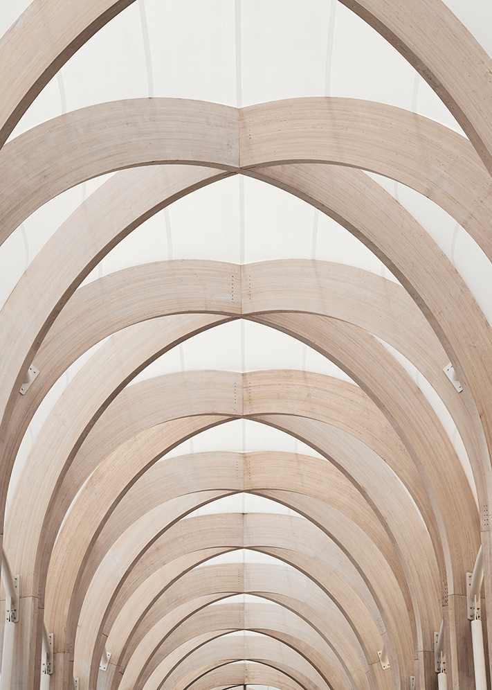 The hotel’s curved glass roof has inspired a 110 metre long walkway with gently inclined steps alongside travellators, all framed by a silhouette that echoes the hotel. The arched glulam structure in Italian larch forms an arcade covered with a roof of transparent fluoroplastics. The light, curvy roof is meant to protect visitors from rain while still admitting light and giving the arcade clear contact with the outside world. The sides have therefore been left open, which also provides good ventilation and reduces the need for air-conditioning. The glulam frame reaches a height of 15 metres, and each element is carefully designed to support the next. The structure comprises a diagonal glulam grid with steel braces.