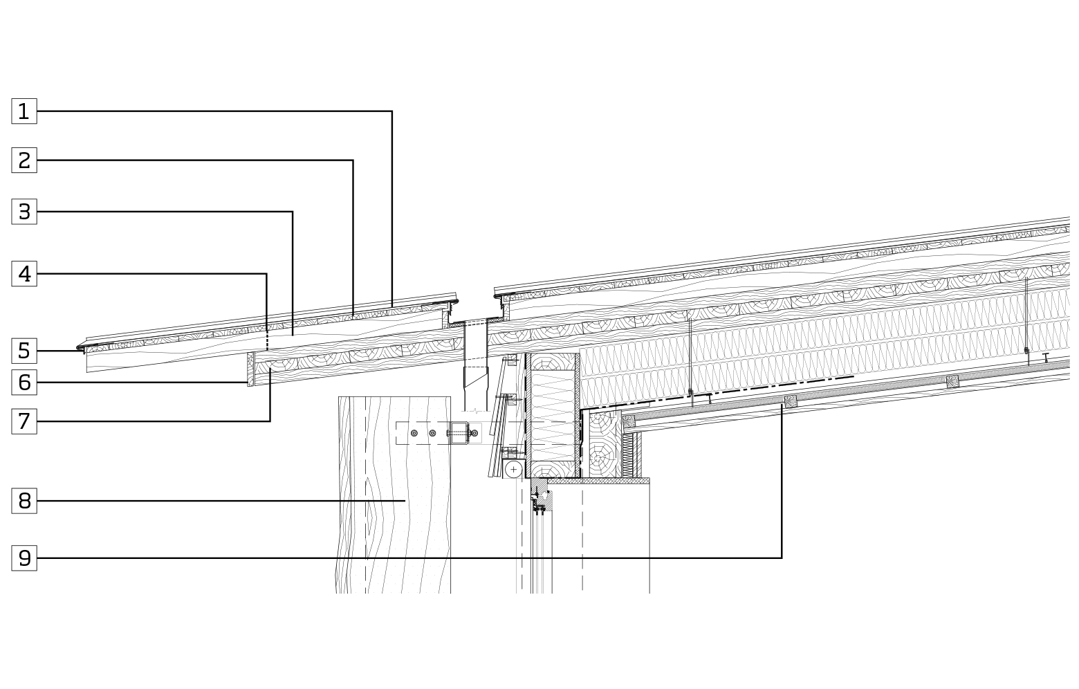 With its ambition to embrace the forest and wood in every which way, the project was soon named Woody. Behind the larch façade sits a glulam post and beam structure with CLT walls and floor structures, all in spruce. Mineral wool provides the insulation. The intermediate floor comprises CLT topped with site-cast concrete.
