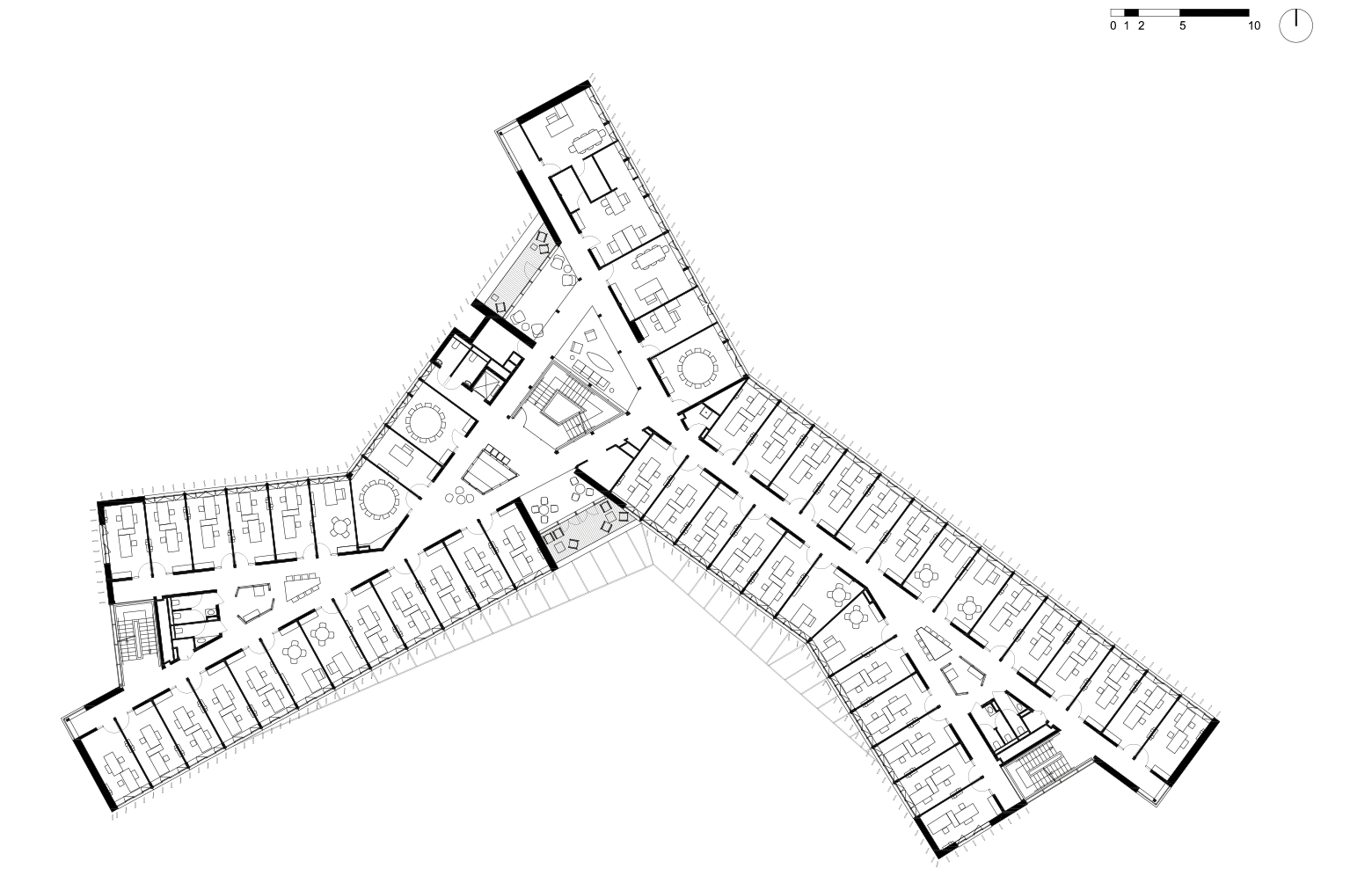 Projecting a metre beyond the outer edge of the planks, the eaves also help to shade the building and protect façade. The zinc-clad roof is able to be so slim because the primary load-bearing structure uses sheets of CLT. From above, the building looks almost like a pile of sticks laid on the ground. The different parts shoot out in all directions and are meant to symbolise the way the agency works on public health and healthcare provision.
