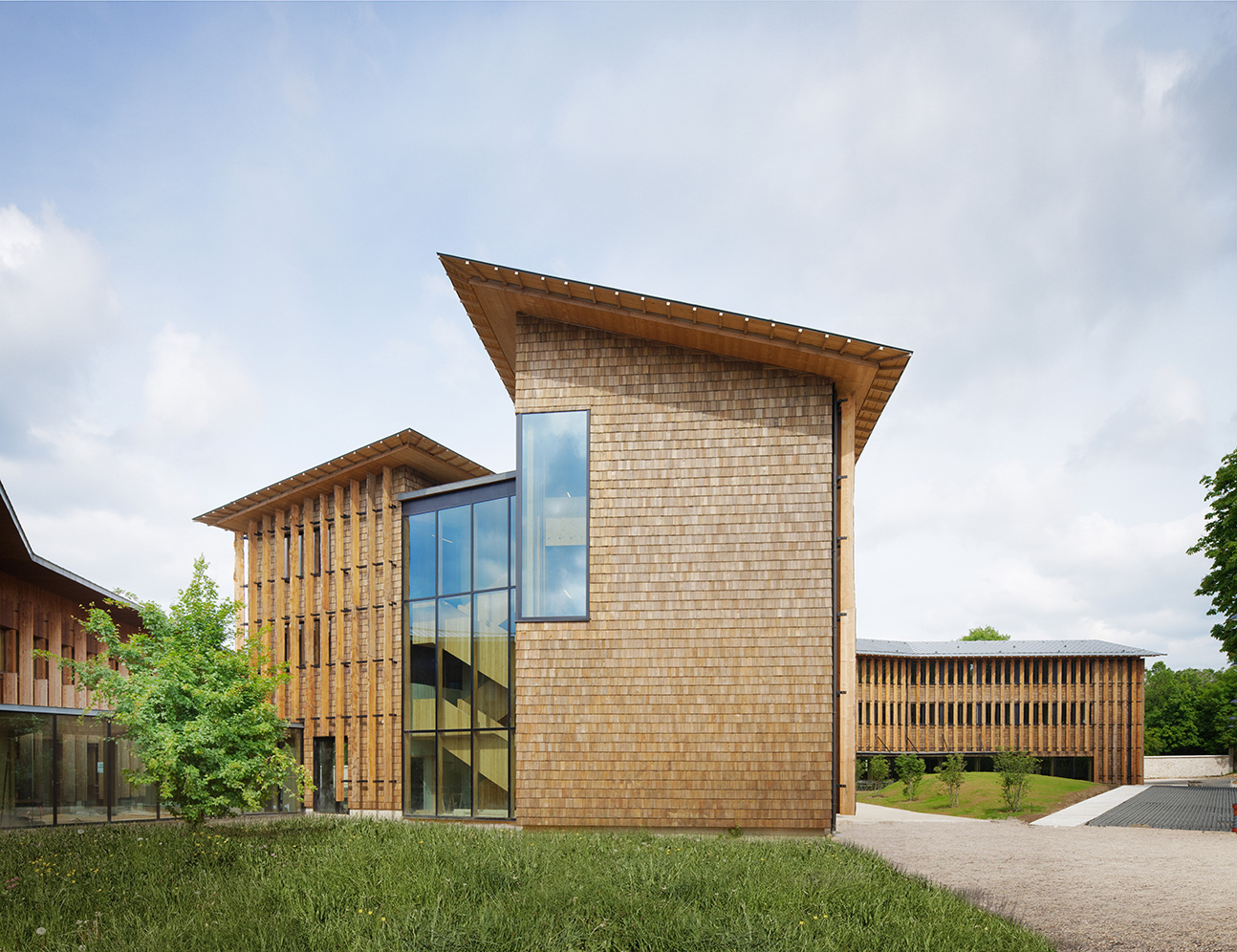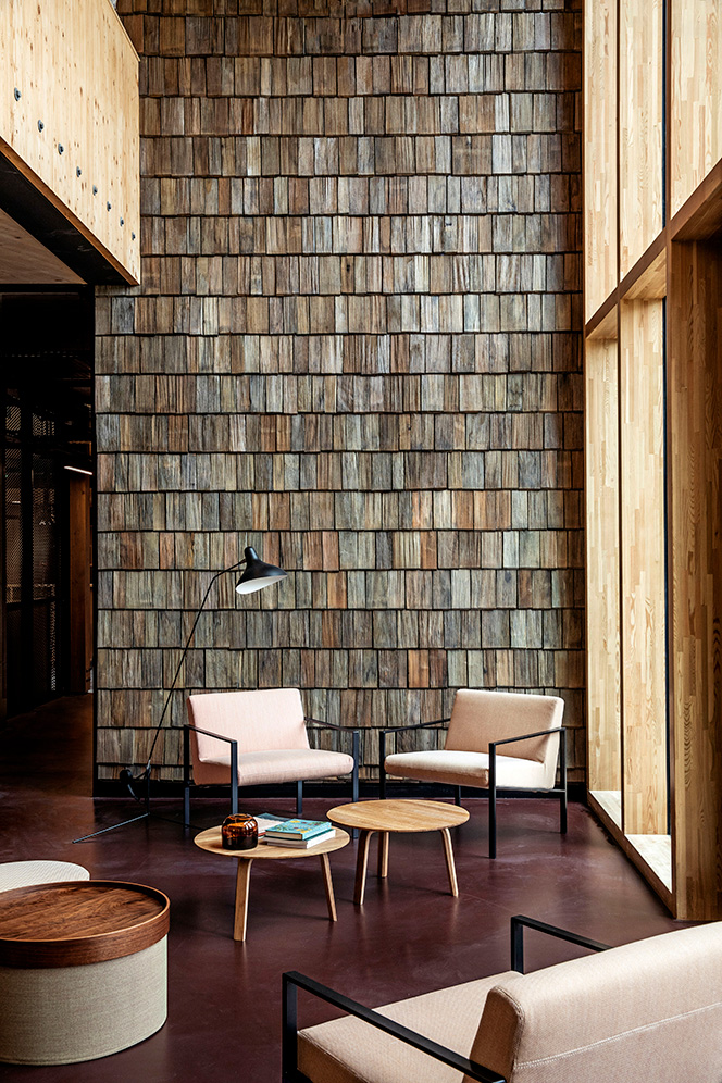 Anne-Cécile explains that they always strive to use the right material in the right place. Few buildings can match the ability of this office block to merge so well into its surroundings. The façade demonstrates a perfect balance of beauty and function. Attractive, hand-cut larch shingles sit below the windows, and on the long sides roughly hewn planks line almost the entire elevation, rising vertically like tree trunks.