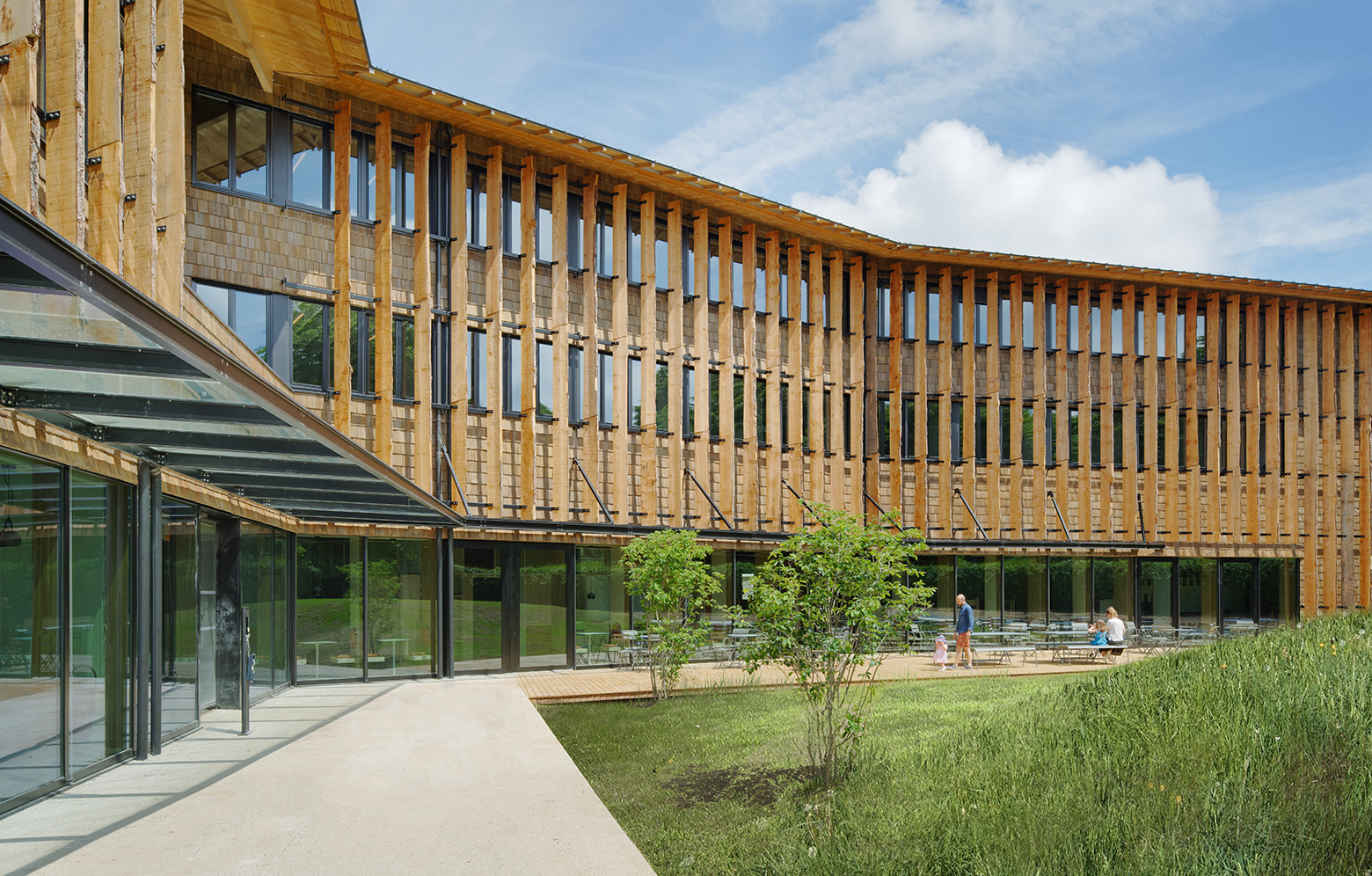 However, the vertical planks are not just an aesthetic feature, but also a sunscreening solution that in French is called a brise-soleil. The biggest challenge was finding larch trees that were long and straight enough. With their wide spacing around half a metre apart, they let in light without restricting the woodland views. Yet from a side angle they provide shade for the building. This regulates the indoor temperature without the need for air conditioning, so only one room in the whole building has it.