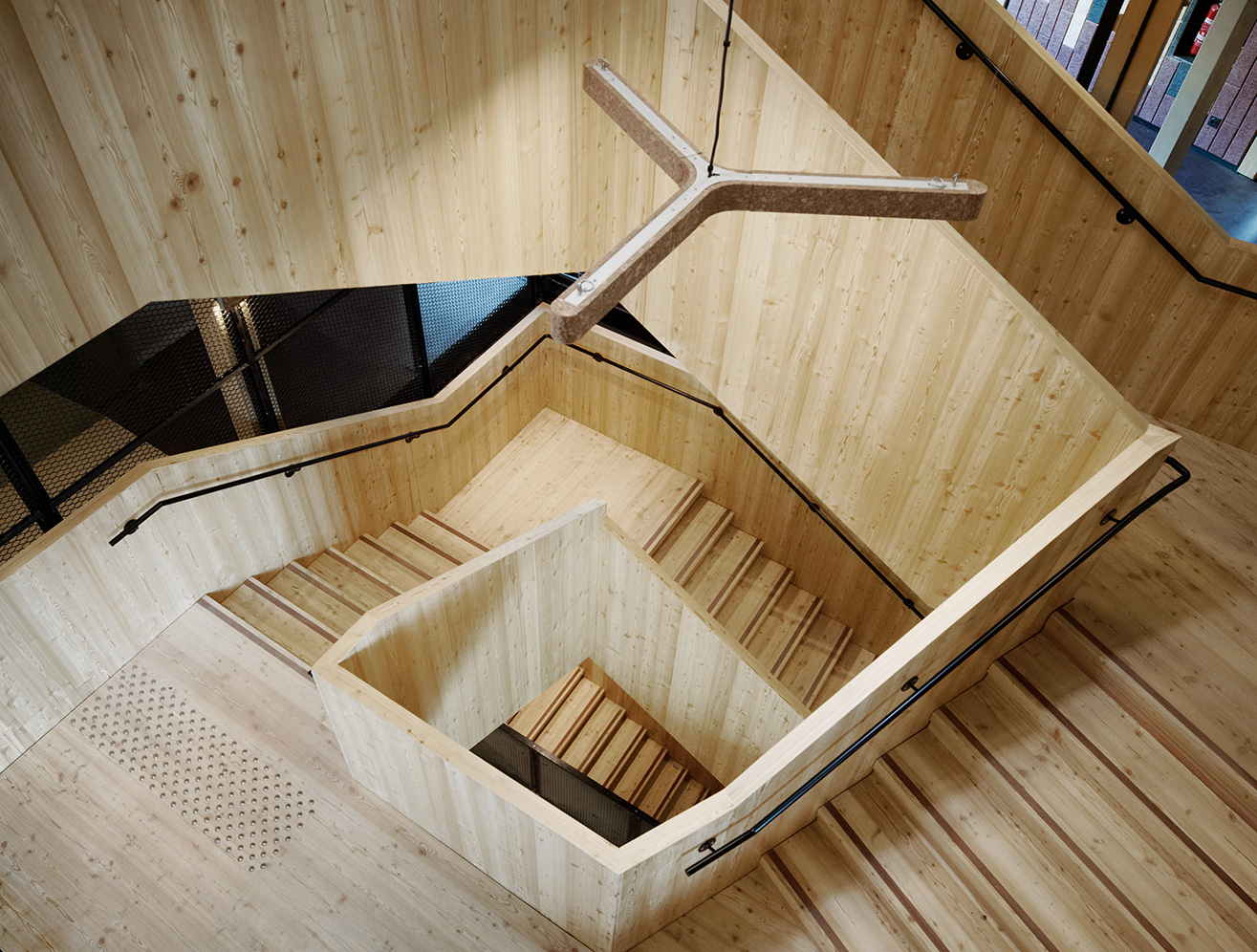 Inside the building, the communal spaces have been designed to encourage informal meetings. The cafe and the restaurant make use of wooden structures to create a mix of different seating for groups of various sizes, as well as smaller rooms within a room. The floors are partly solid oak and partly natural rubber, while the walls are lined with acoustic wood wool tiles in the project’s interior colour palette: muted pink, natural white and pigeon blue. Cork is used in lamps, and the staircases are made from CLT, glulam and concrete. The stairs are centrally located, generously proportioned and light to encourage employees to exercise instead of taking the lift. With large furnished outdoor terraces, they are also encouraged to sit and eat outside in the fresh air. The material used in this context is chestnut. All the wood used comes from forests with either FSC or PEFC certification, and the architects have made informed decisions about materials, adhesives and surface treatments.