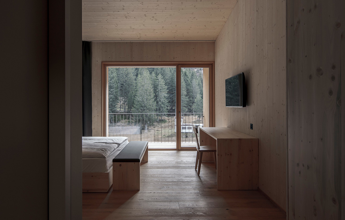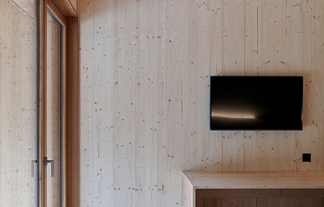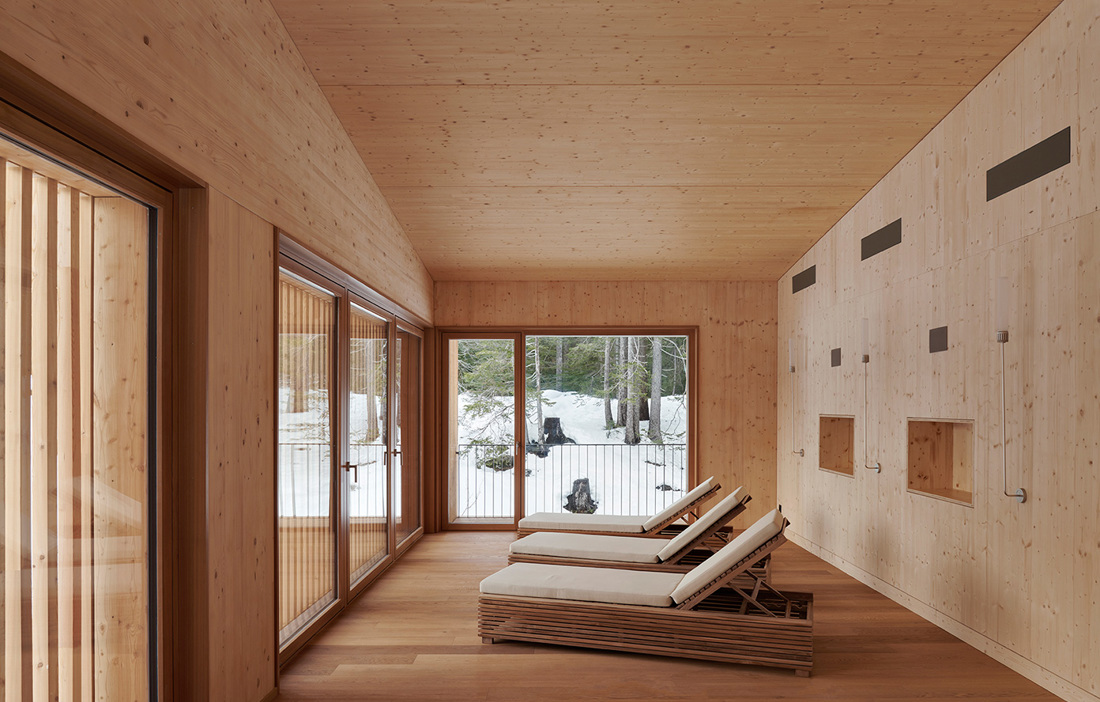 The concrete basement level contains the changing rooms and services. Above that everything is wood, most of which has been left exposed. The ground floor has restaurants and other public spaces, with moveable walls so the rooms can easily be reconfigured for larger gatherings. The upper floor houses guest bedrooms and a spa. The structure in CLT and glulam is based on a 4.6 metre wide modular measurement, which rationalised the construction process so the skiers could quickly begin using the new facilities.