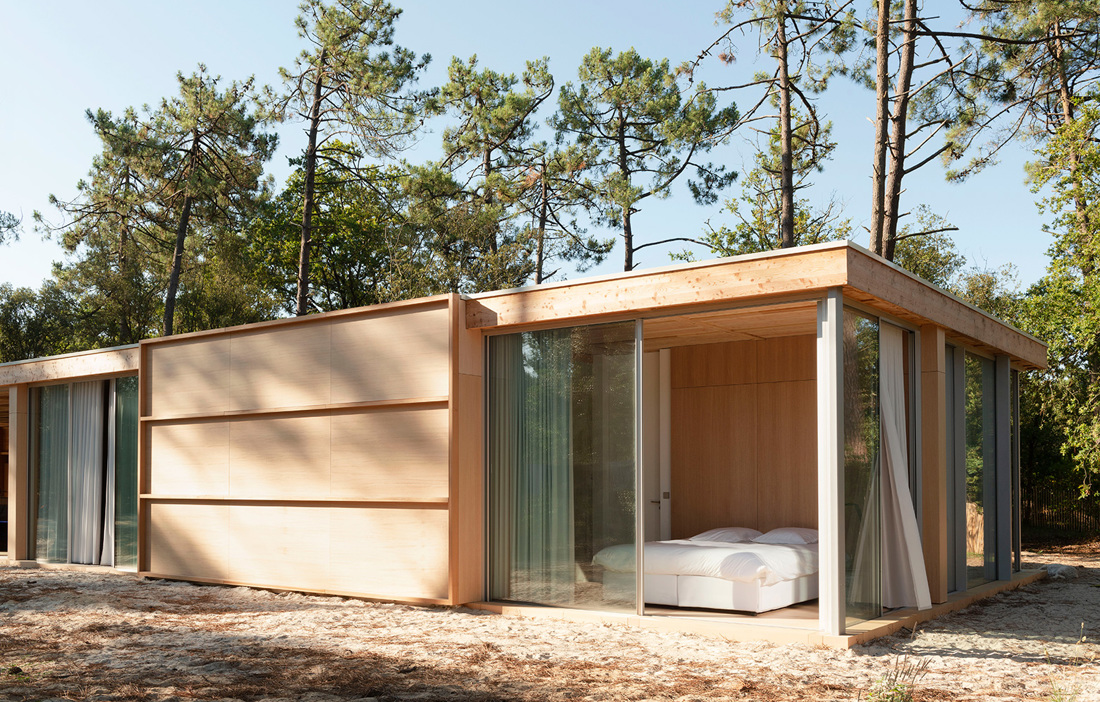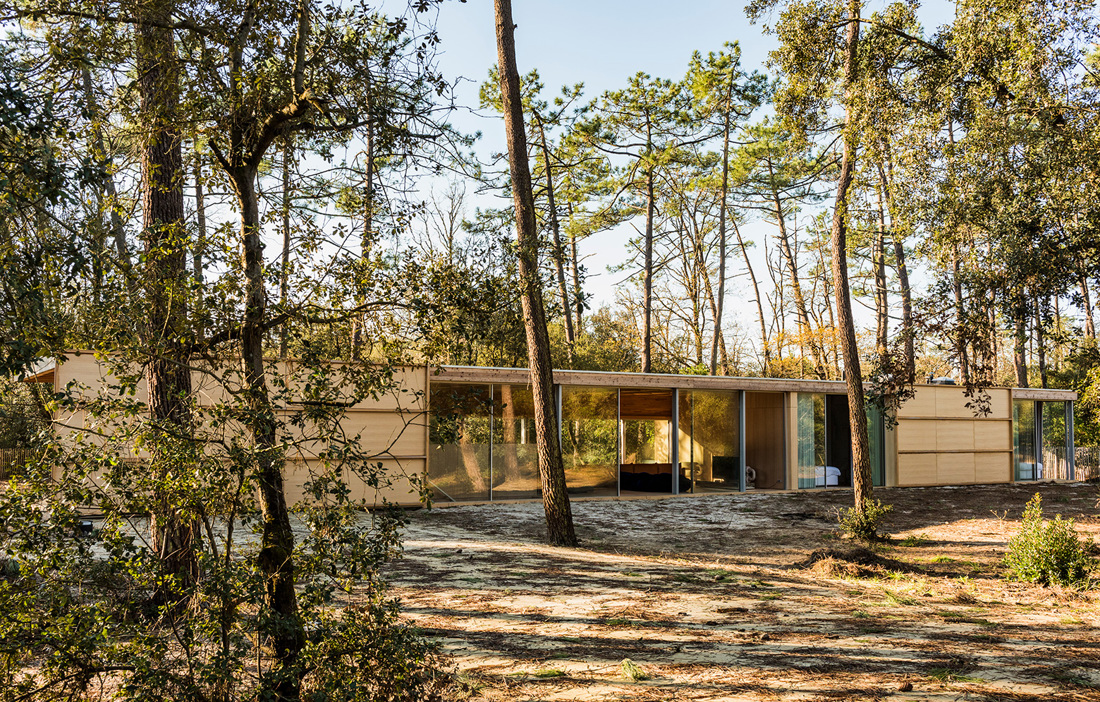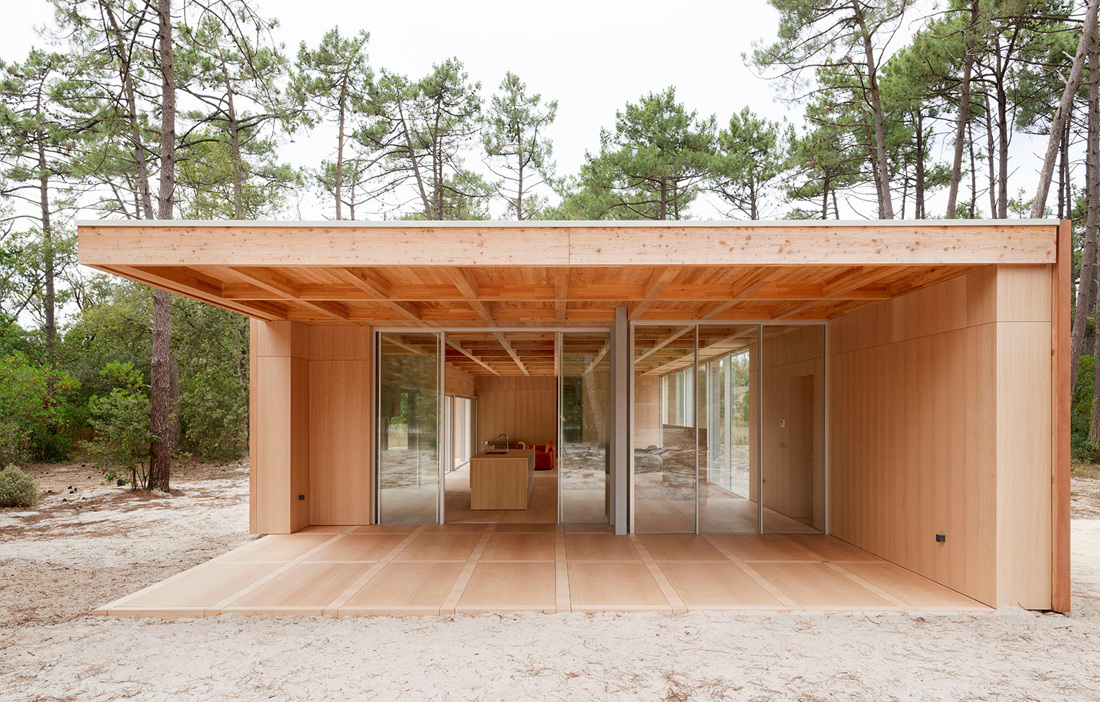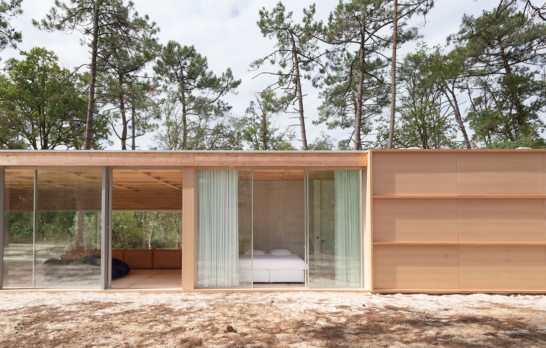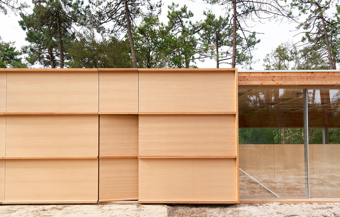 The coffered ceiling comprises 136 larch panels and the floor has the same number of panels in okoume (a West African wood), creating a symbiosis between up and down. Neither the ceiling or the walls feature any screws, and the number of steel components has been kept to a minimum by using shadow joints instead. The roof is supported by a 16 metre glulam beam. Complementing the wood are glazed sliding doors standing three metres tall. However, the site is exposed to harsh weather and to make sure the roof and glass remain intact, the architects have reinforced parts of the structure with concrete, concealing it inside the wood walls. The surrounding forest also protects against strong winds, while still admitting the gentle sound of the waves from the nearby Bay of Biscay.
