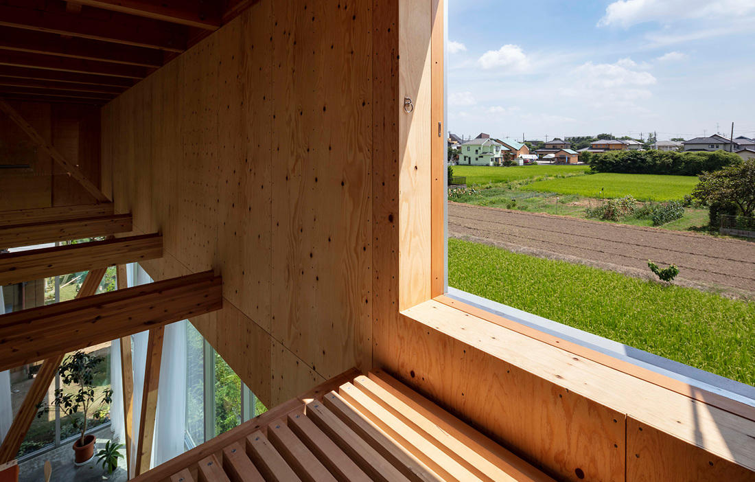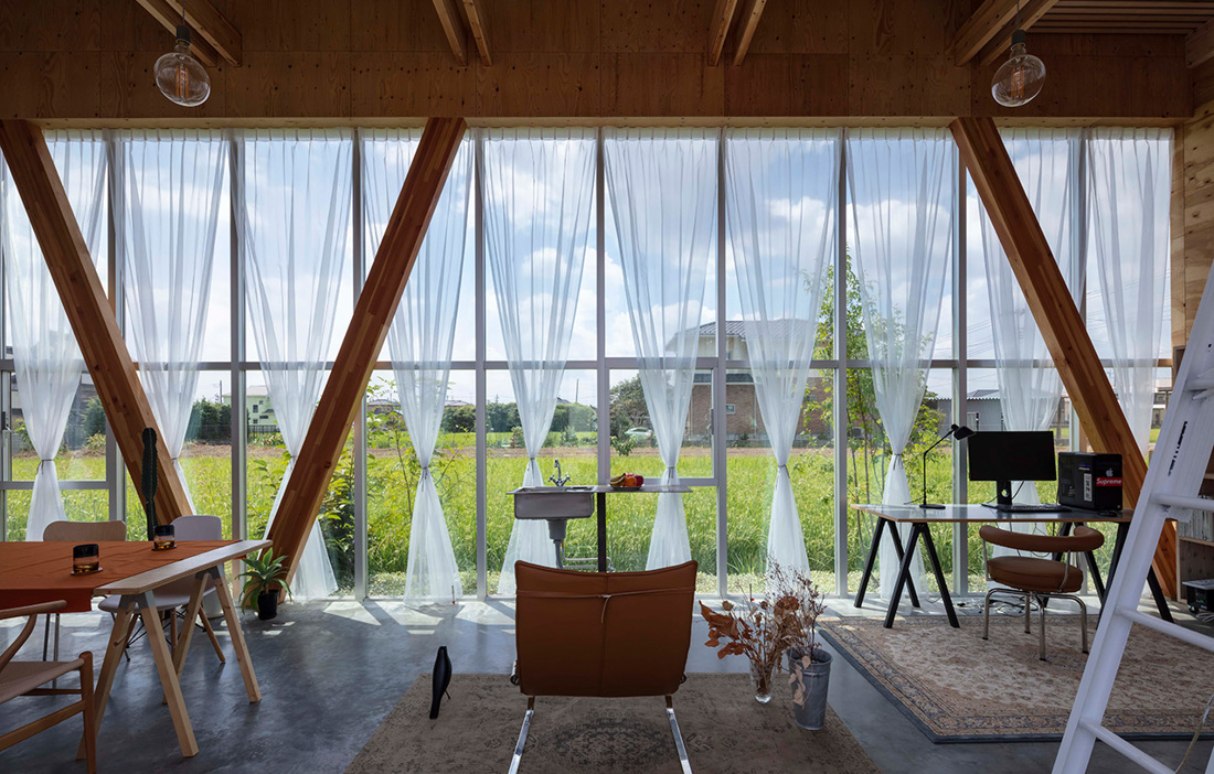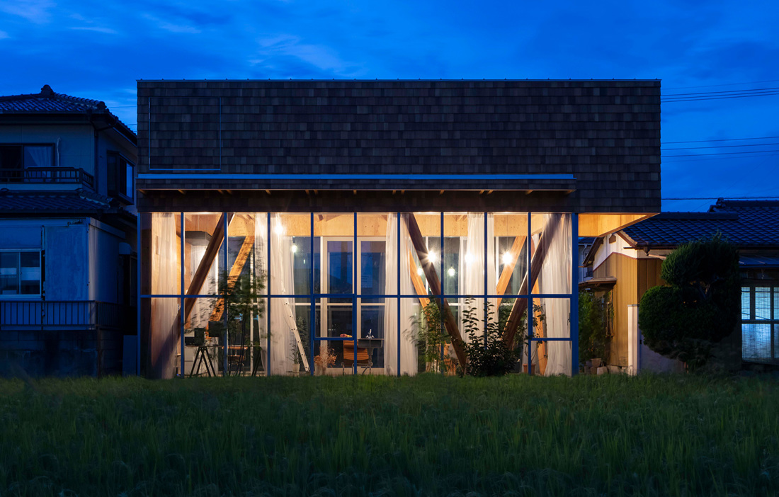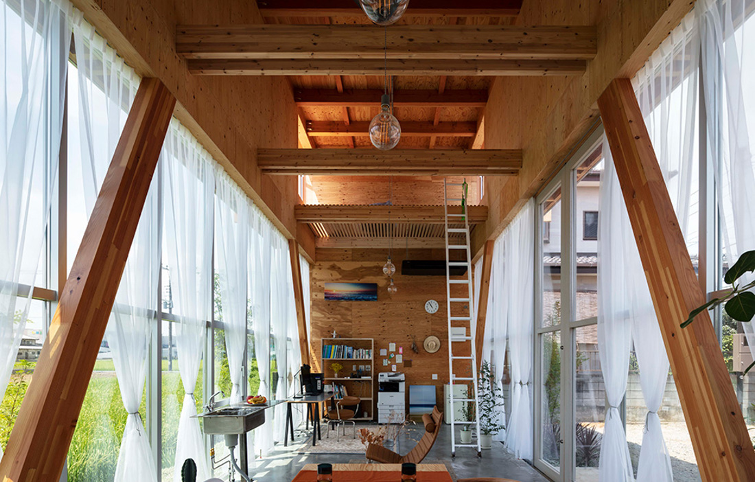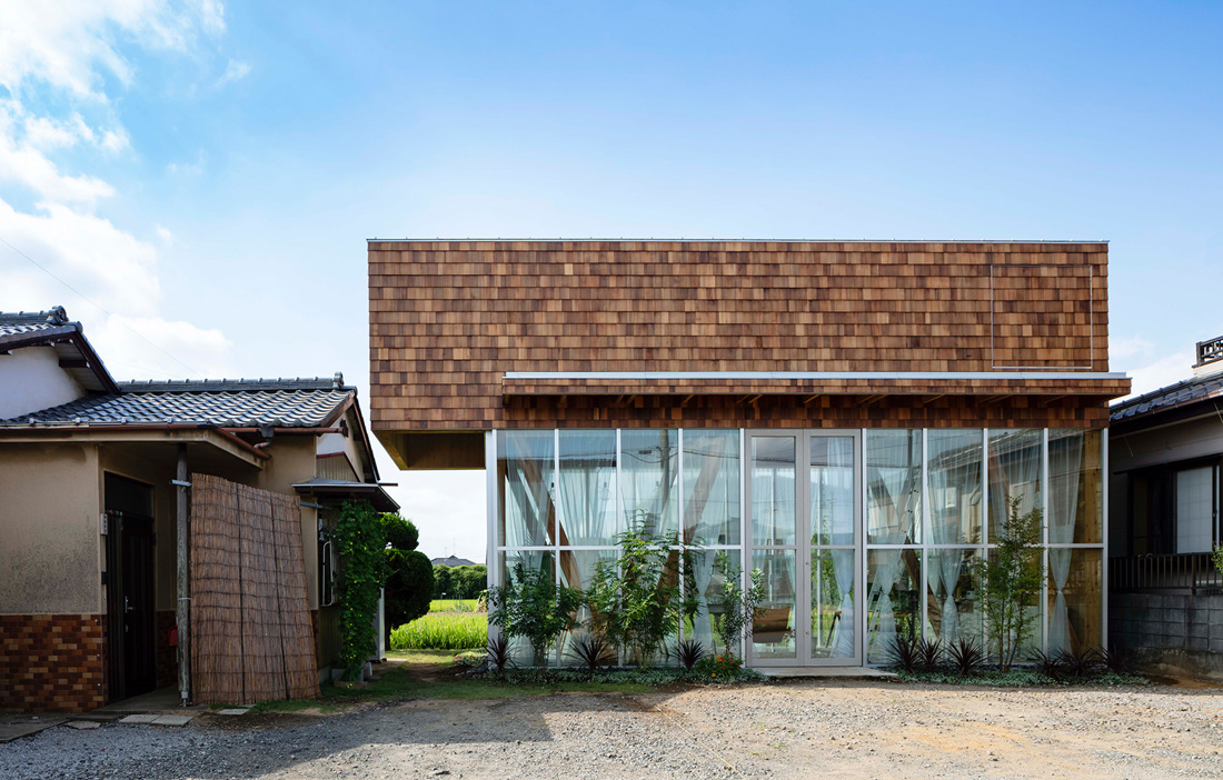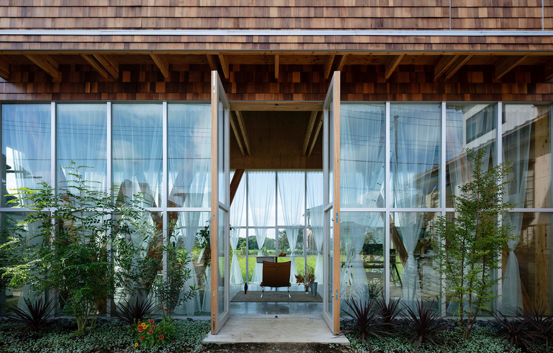 Bordering one of Japan’s rice farms stands a home that at first sight appears to float, with the ground floor’s glazed structure and narrow shape reminiscent of a greenhouse. The architects wanted to create anything but the usual wooden design supported by posts and load-bearing walls. The result was a shingled wooden structure in pine, supported by diagonal glulam posts positioned inside the glazed sections.