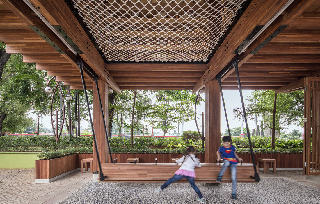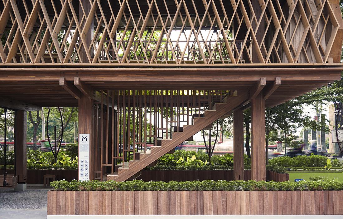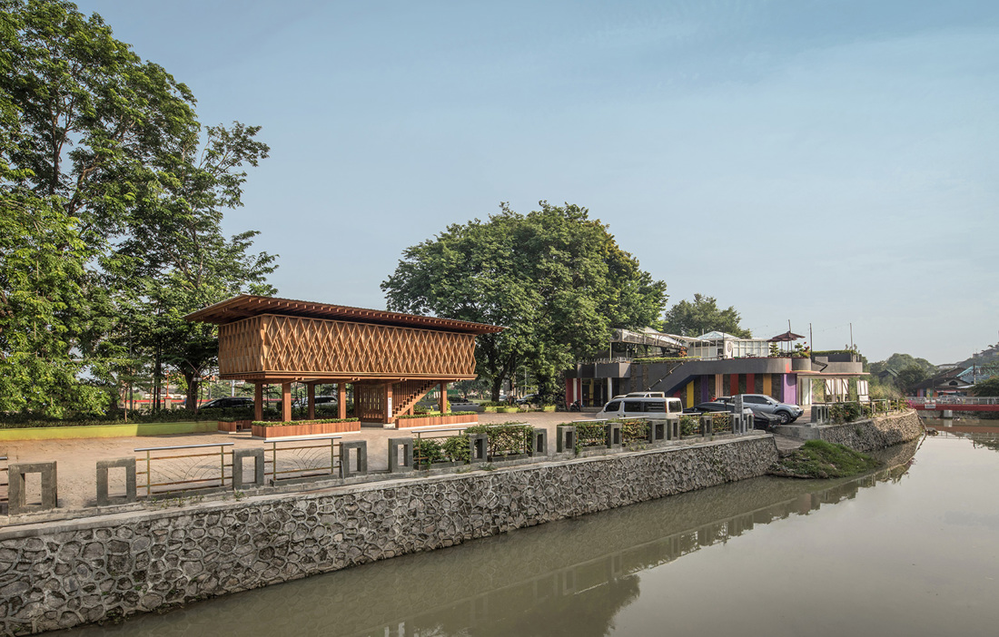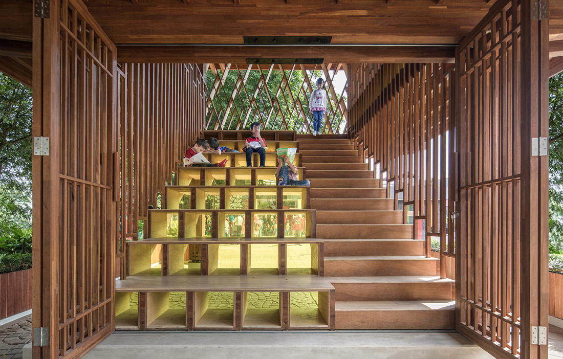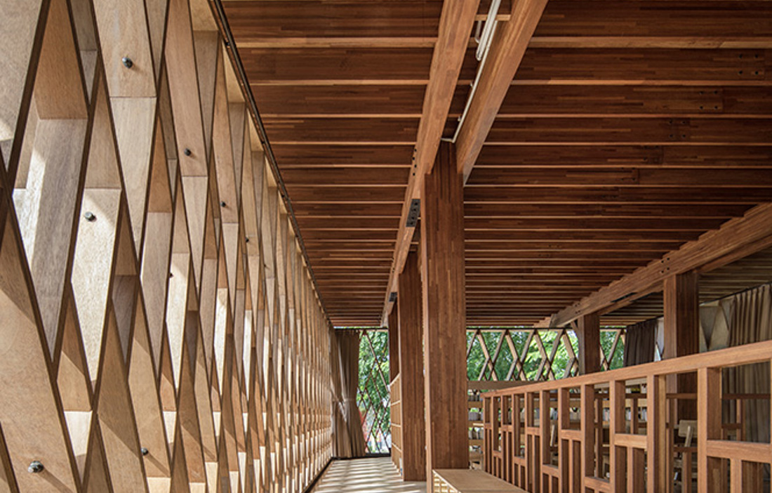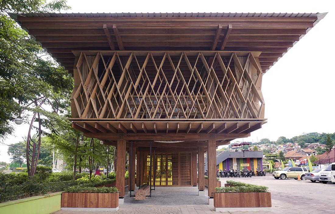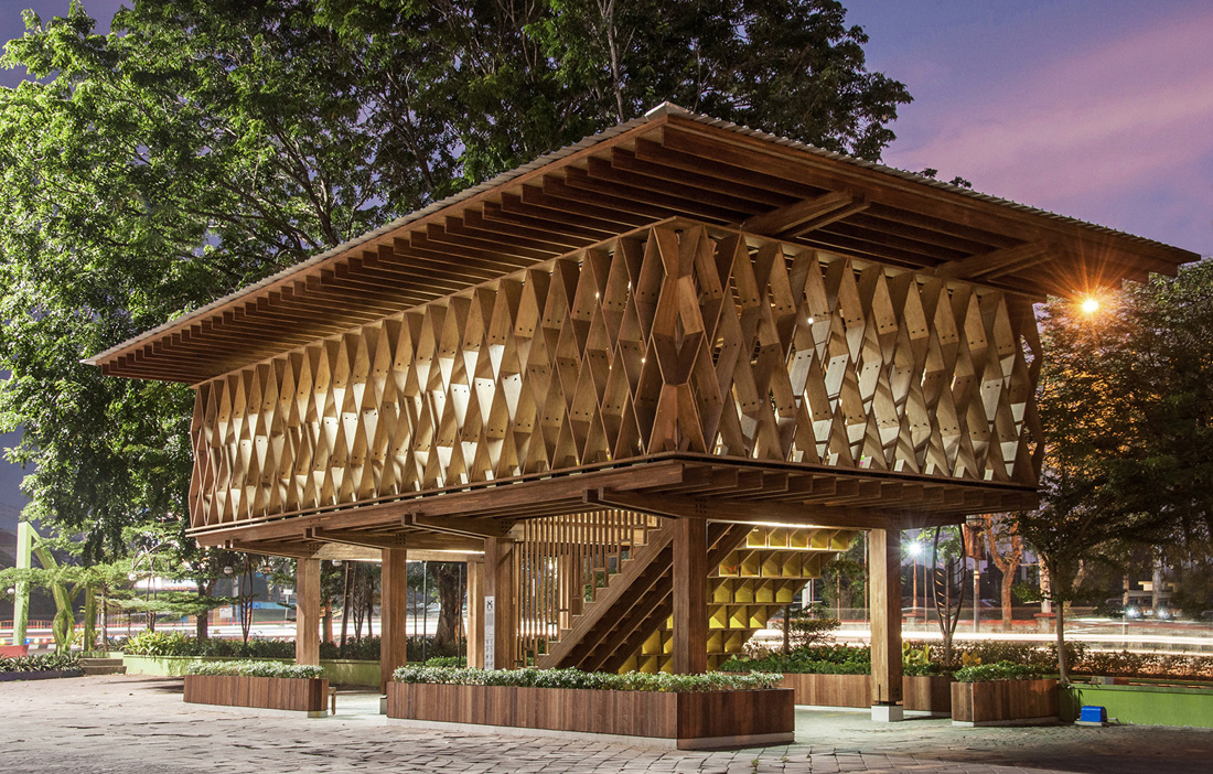 A project is under way in Indonesia aimed at encouraging more people to read books. Five locations across the country have been given a microlibrary that also serves as a social space. The latest of these is in Semarang, where the design displays influences from the nation’s traditional stilt houses – “ruma panggang”. The ground floor has been left open on all sides and is used for workshops and social gatherings. The upper floor housing the actual library is finished in a repeated diamond pattern, based on the German construction system “Zollinger Bauweise”. A similar pattern appears on the dragon that legend says lives in the area, which makes the design easy to understand while also helping to create an exciting visitor attraction. The structure uses meranti (shorea) plywood in various thicknesses and performs an important function in preventing direct sunlight from flooding the space and thus maintaining a pleasant climate within.