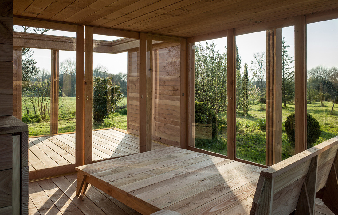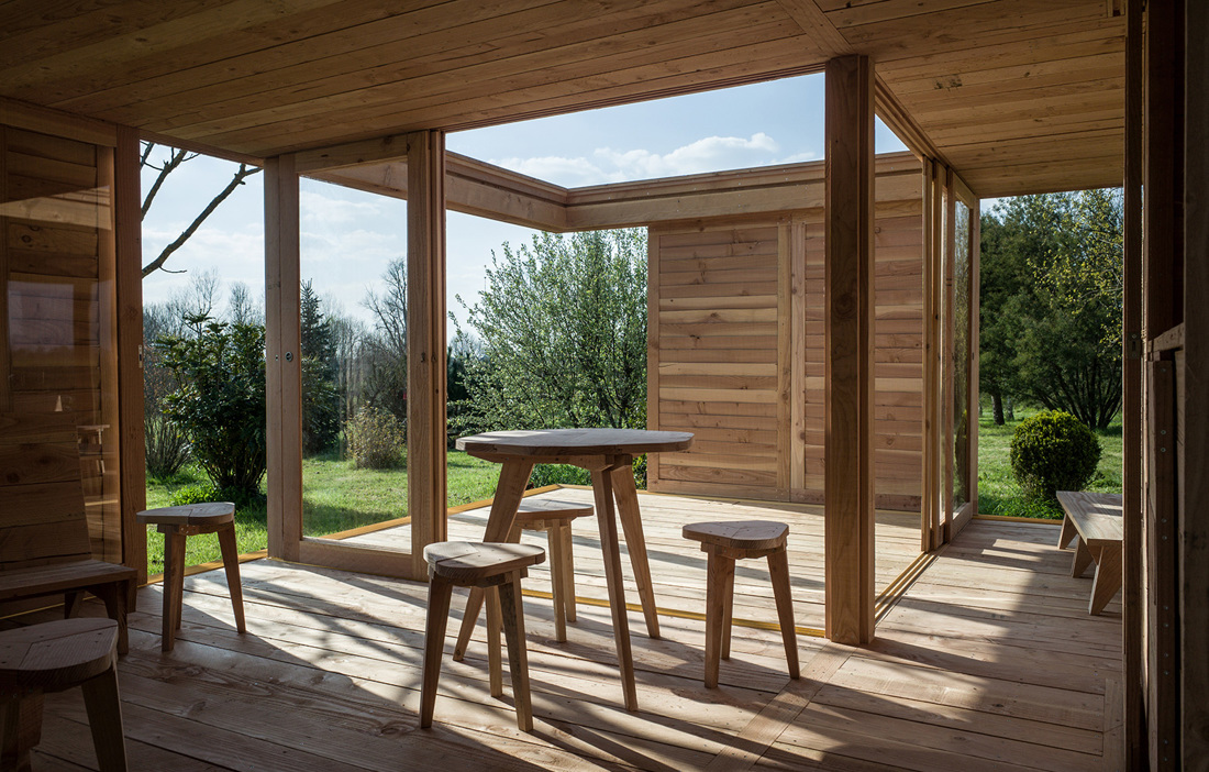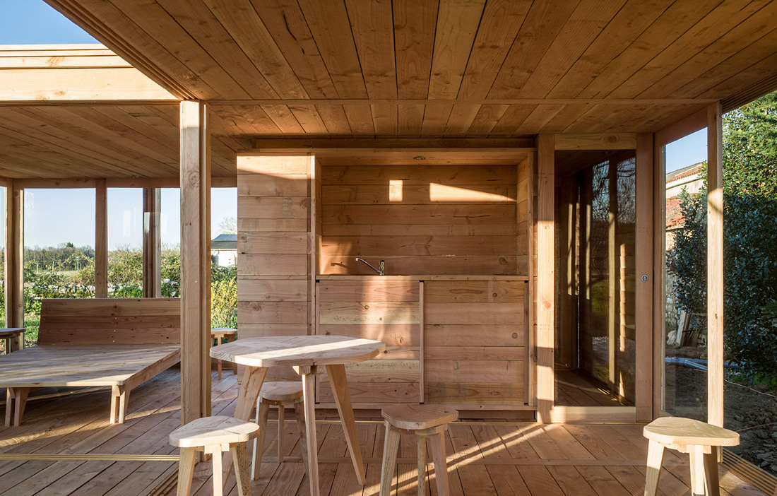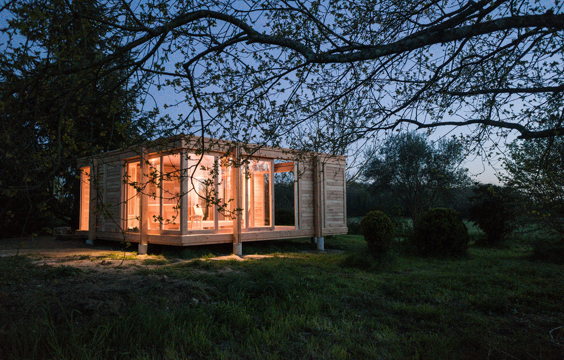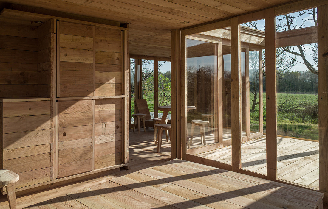 The 36 square metre guesthouse is made up of four square modules, one of which has no roof and is used as an outdoor space. In addition, there is a bedroom and a living room, plus another module containing both the bathroom and a small, built-in kitchen. To make the most of the expansive views and to increase the volume of the modest building, many of the walls are moveable, allowing guests to let in sun, light and air as they wish. The furniture is also Douglas fir, creating a cohesive overall feel.