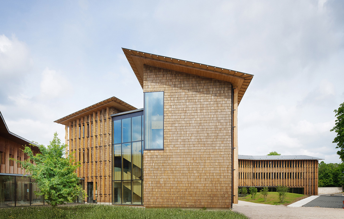 Anne-Cécile explains that they always strive to use the right material in the right place. Few buildings can match the ability of this office block to merge so well into its surroundings. The façade demonstrates a perfect balance of beauty and function. Attractive, hand-cut larch shingles sit below the windows, and on the long sides roughly hewn planks line almost the entire elevation, rising vertically like tree trunks.