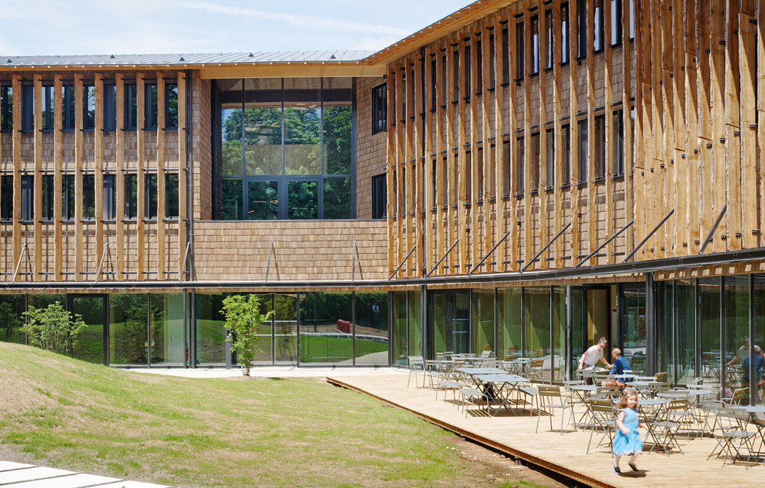 However, the vertical planks are not just an aesthetic feature, but also a sunscreening solution that in French is called a brise-soleil. The biggest challenge was finding larch trees that were long and straight enough. With their wide spacing around half a metre apart, they let in light without restricting the woodland views. Yet from a side angle they provide shade for the building. This regulates the indoor temperature without the need for air conditioning, so only one room in the whole building has it.