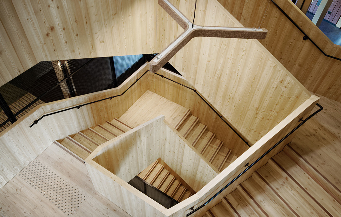 Inside the building, the communal spaces have been designed to encourage informal meetings. The cafe and the restaurant make use of wooden structures to create a mix of different seating for groups of various sizes, as well as smaller rooms within a room. The floors are partly solid oak and partly natural rubber, while the walls are lined with acoustic wood wool tiles in the project’s interior colour palette: muted pink, natural white and pigeon blue. Cork is used in lamps, and the staircases are made from CLT, glulam and concrete. The stairs are centrally located, generously proportioned and light to encourage employees to exercise instead of taking the lift. With large furnished outdoor terraces, they are also encouraged to sit and eat outside in the fresh air. The material used in this context is chestnut. All the wood used comes from forests with either FSC or PEFC certification, and the architects have made informed decisions about materials, adhesives and surface treatments.