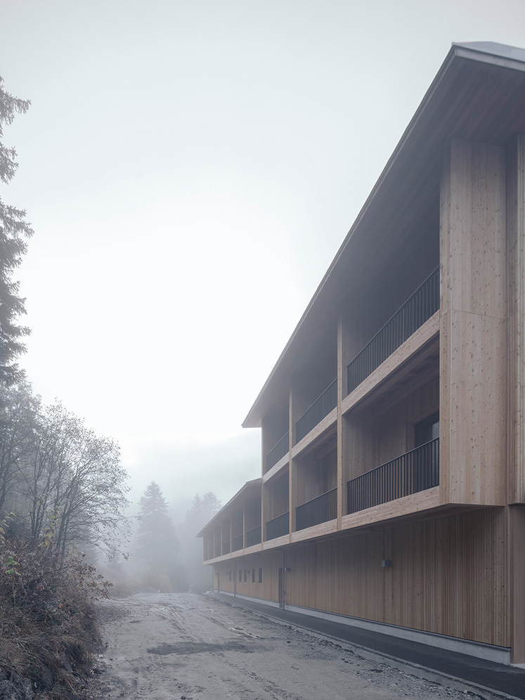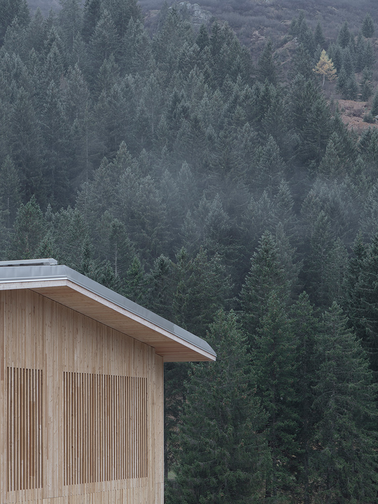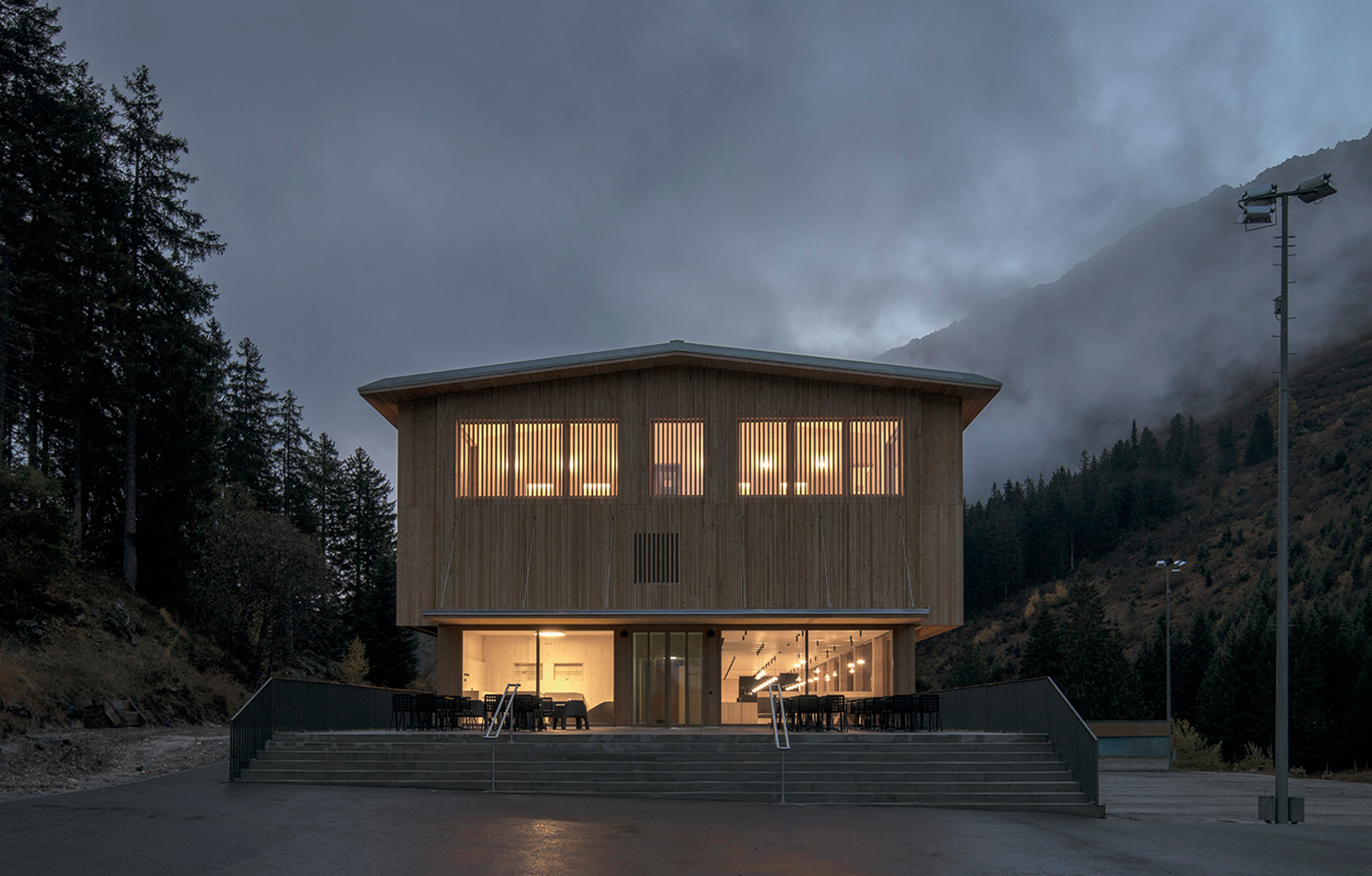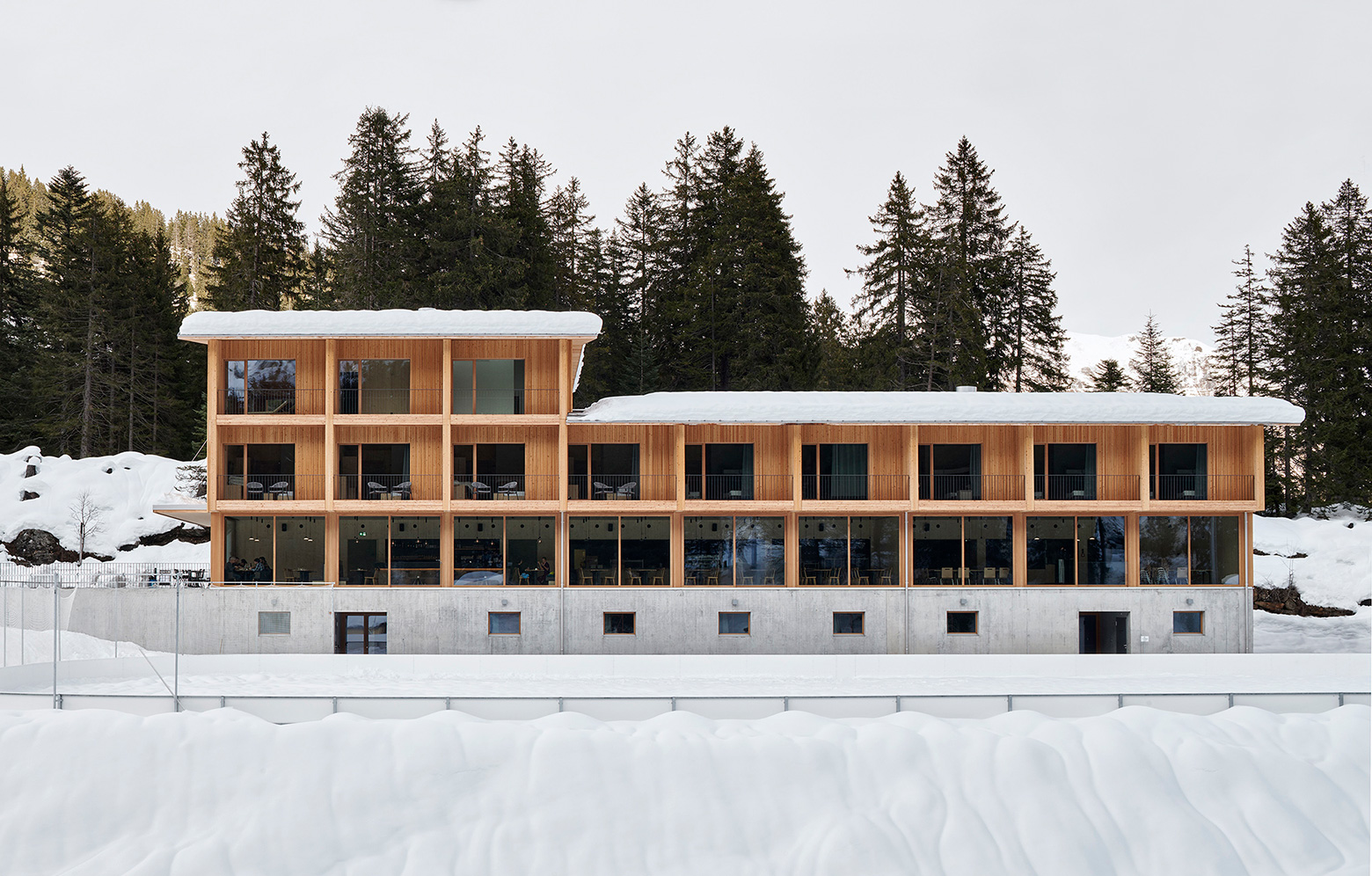 In the Swiss Alps, 1,400 metres above sea level, stands a cross-country skiing centre that attracts families and elite skiers with its well-prepared trails in a stunning environment. Since the centre was created in the 1970s, it has been sympathetically expanded. The latest addition is a building with social facilities and accommodation, carefully inserted between existing buildings so as not to pull focus from the surrounding landscape, which remains the star of the show.
