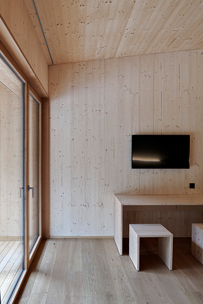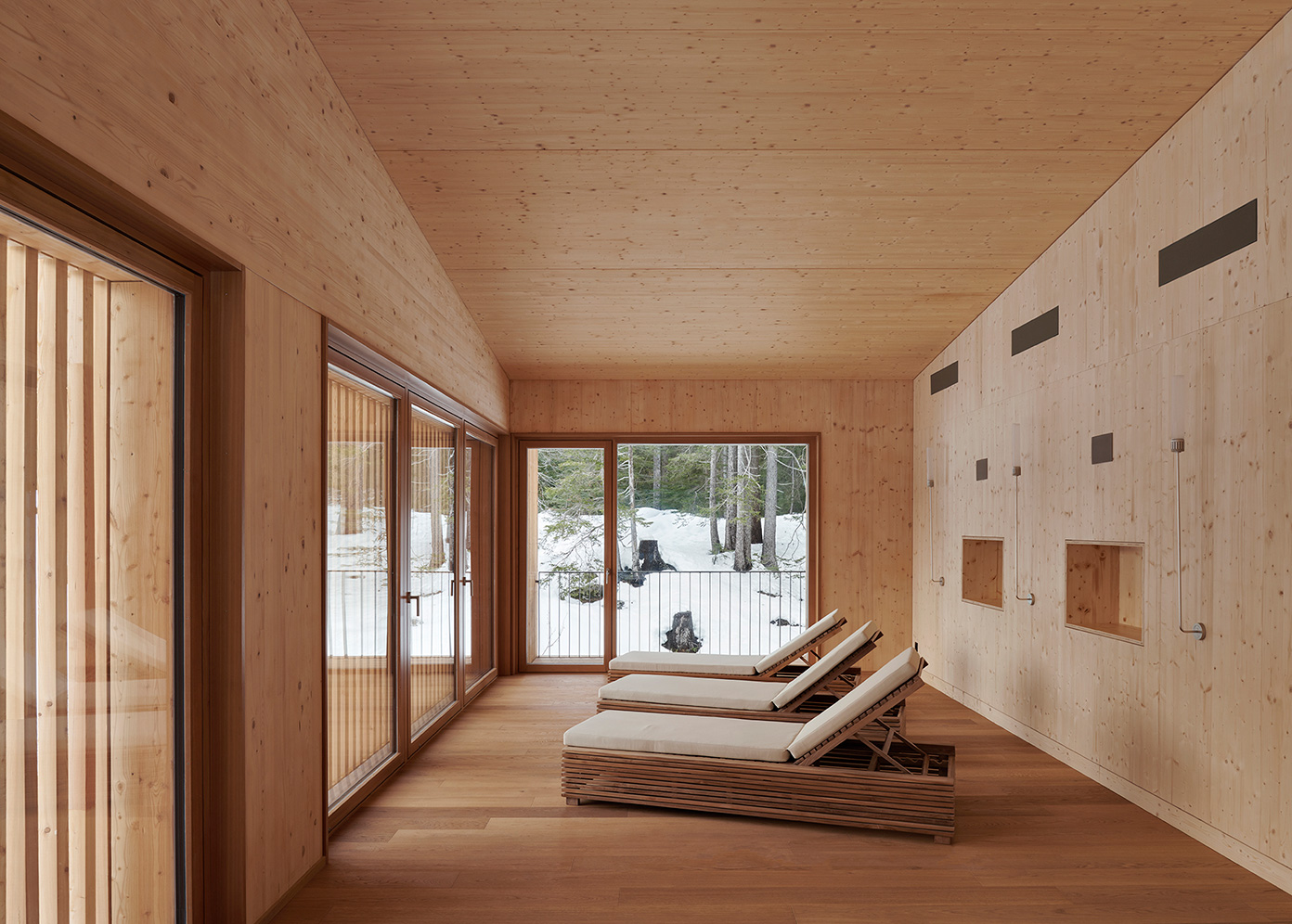 The concrete basement level contains the changing rooms and services. Above that everything is wood, most of which has been left exposed. The ground floor has restaurants and other public spaces, with moveable walls so the rooms can easily be reconfigured for larger gatherings. The upper floor houses guest bedrooms and a spa. The structure in CLT and glulam is based on a 4.6 metre wide modular measurement, which rationalised the construction process so the skiers could quickly begin using the new facilities.