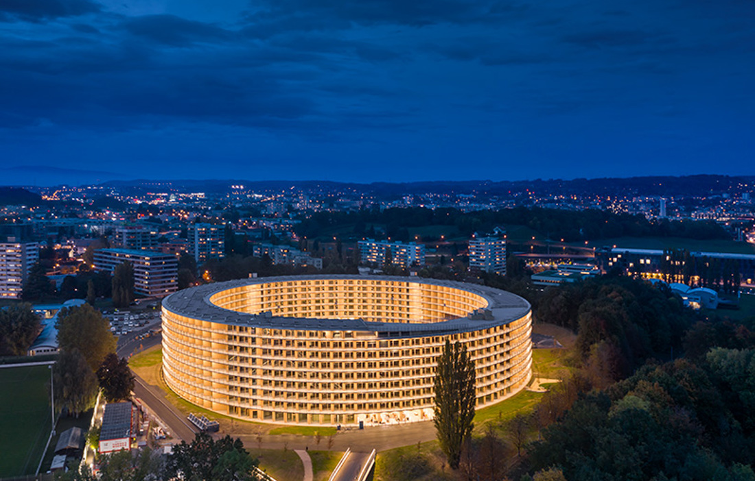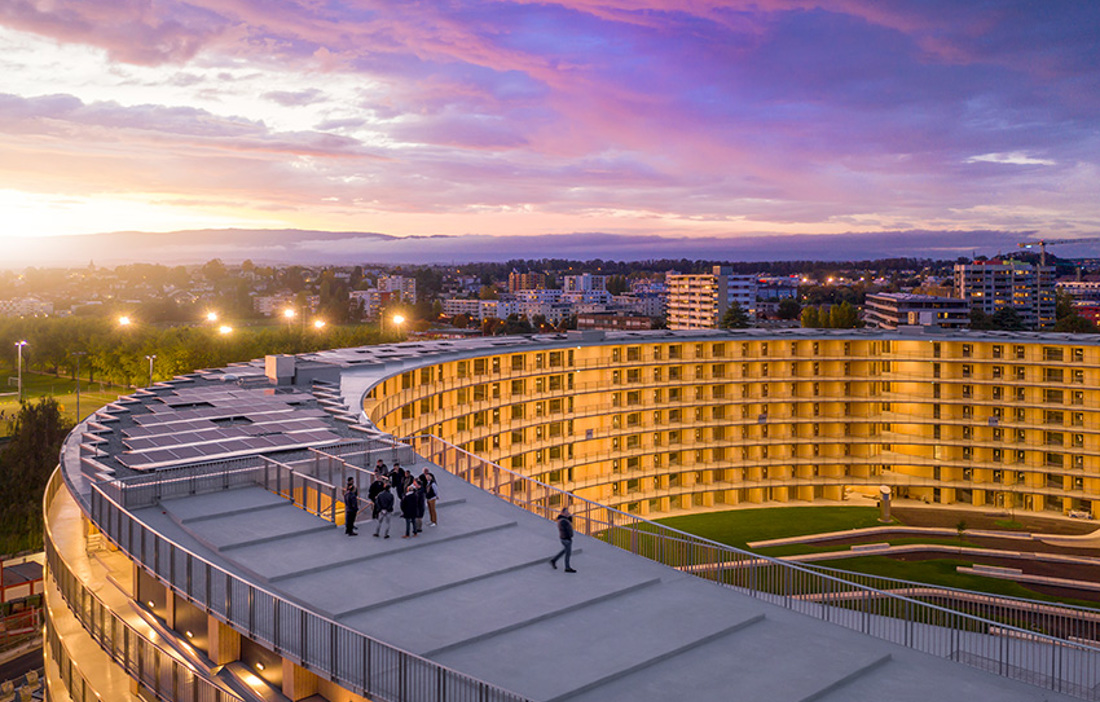 The student accommodation at the University of Lausanne houses almost a thousand students, who can easily socialise and also withdraw to their rooms. In the large, round building, social interaction and communal spaces are never far away, creating a small town feel where the inner courtyard can also serve as a sports arena, stage and green space.