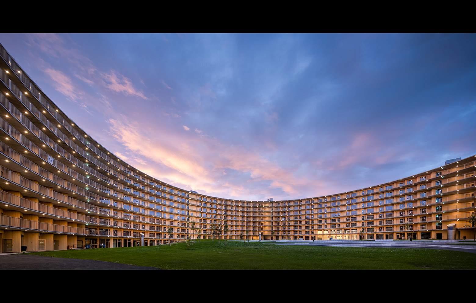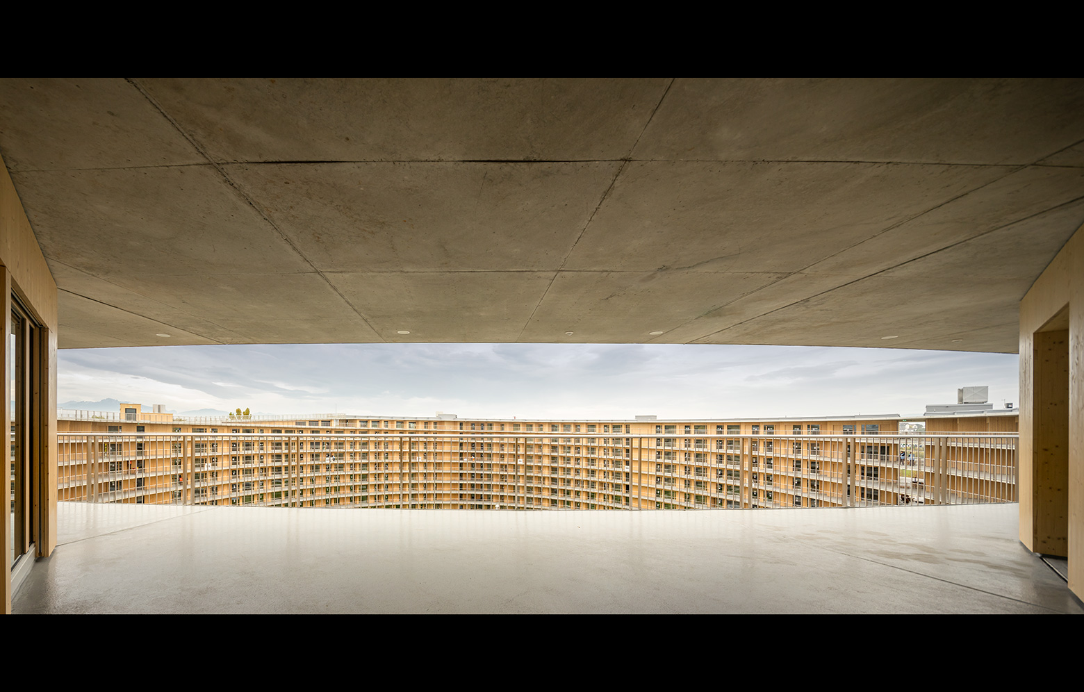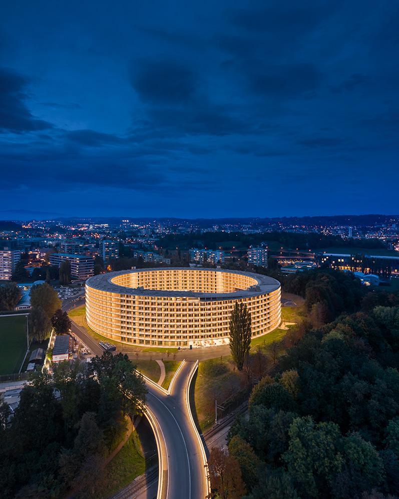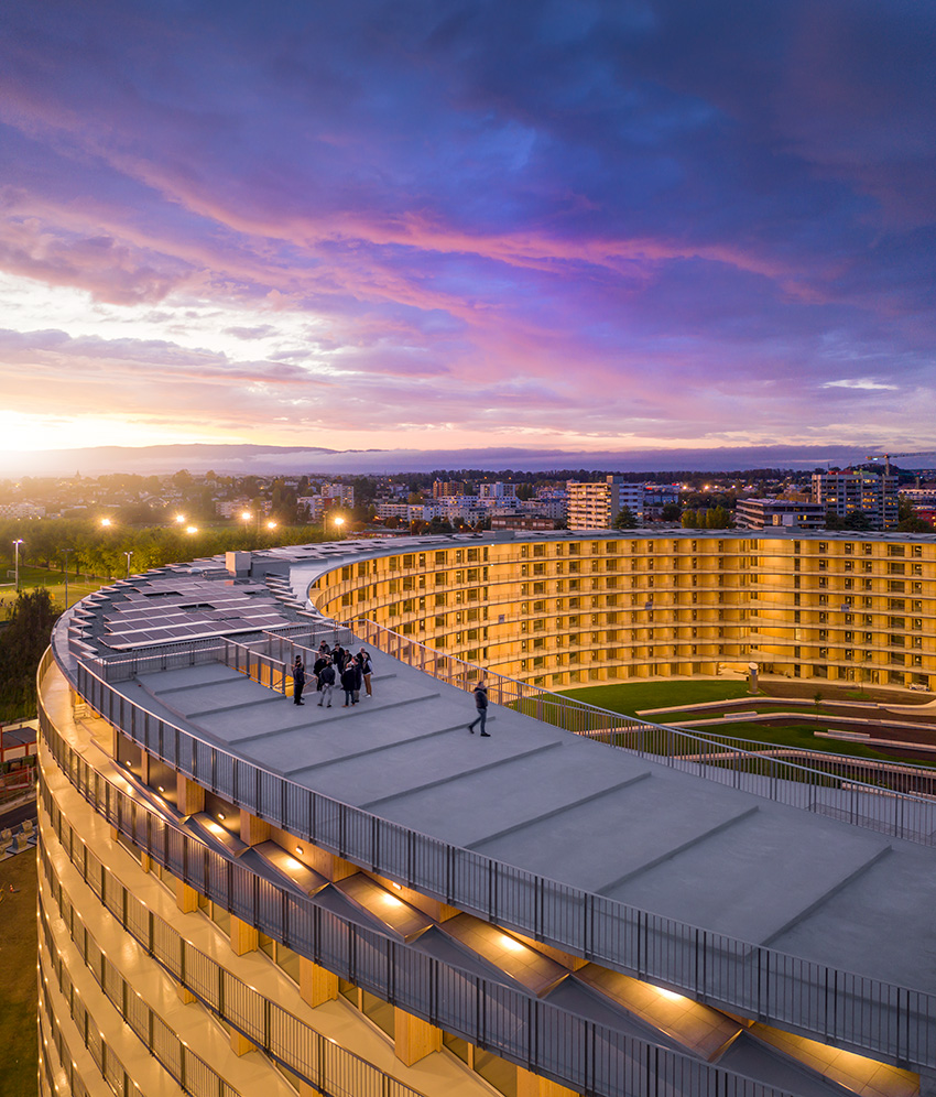 The student accommodation at the University of Lausanne houses almost a thousand students, who can easily socialise and also withdraw to their rooms. In the large, round building, social interaction and communal spaces are never far away, creating a small town feel where the inner courtyard can also serve as a sports arena, stage and green space.