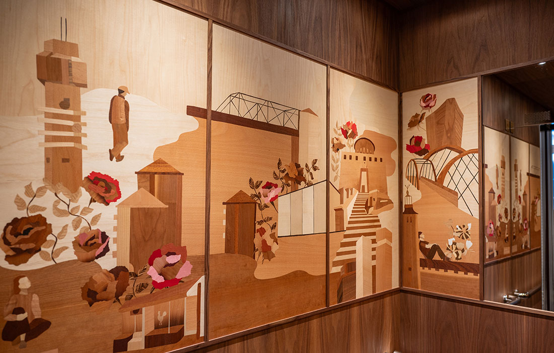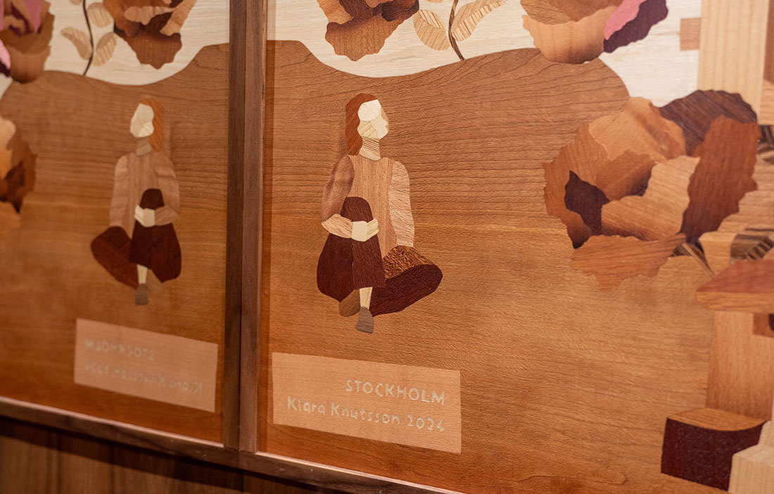 And that's precisely what the hotel has done through collaborations with architects, designers and artists. One of them is Klara Knutsson, who has clad the lift with Stockholm images in intarsia – the term comes from the Italian ''intarsio'', meaning ''inlay'' or ''fitting''.