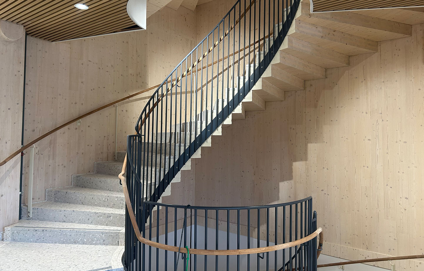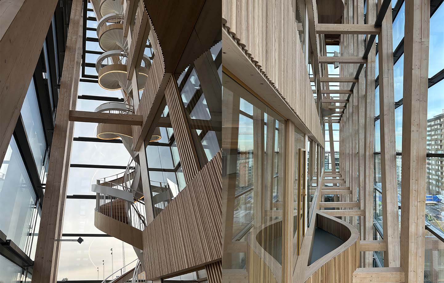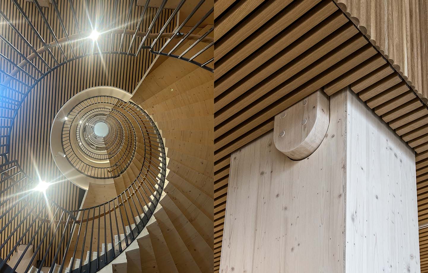 “The staircase that rises through the ten storeys is built entirely from wood and, as far as I’m aware, is unique. The cross-laminated timber and glulam are super-strong materials that are comparable with steel and concrete,” says Bäckman, who adds that Ulrika deserves the credit for the fact that the staircase is spiral rather than straight.