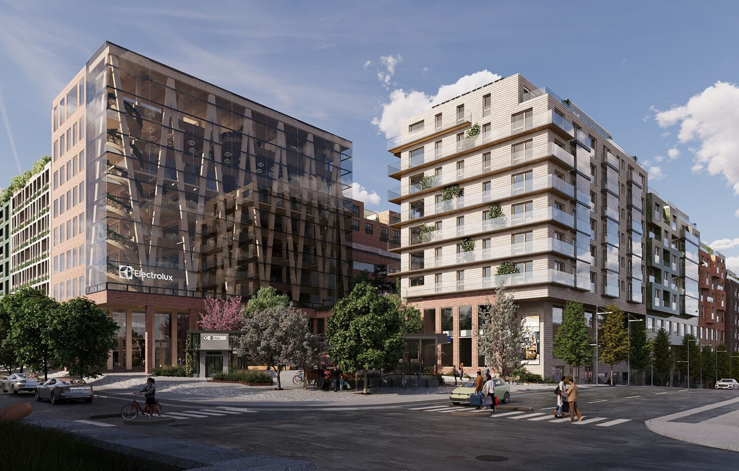 The renovation and extension is the first stage of Greenhouse Sthlm, a mixed development of offices, housing, retail and services. When completed, this little city within a city will create life and movement in a district that has been relatively deserted outside office hours. In the first stage, the Electrolux Group is expanding its headquarters by 8,000 square metres. A new cooperative housing association will also create 114 new homes.