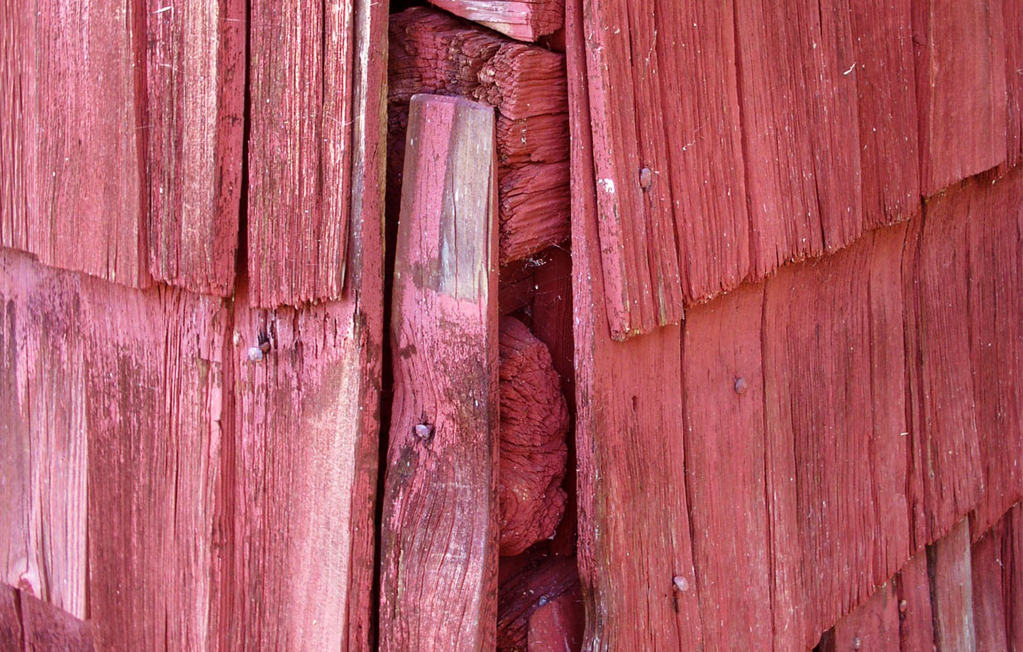 At some point, the interior of the shed has been whitewashed. On the exterior, the logs were originally untreated but at some point before 1560–1580, when the facade was clad in shingles up to 80 centimetres in length, they were tarred. The roof is constructed with Roman-style roof trusses covered with shingles.