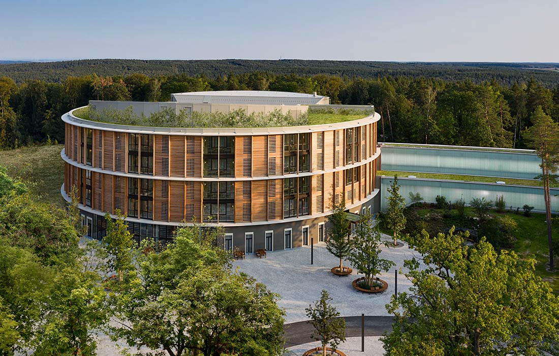 The hospital’s circular floor plan ensures that every patient room enjoys views of the surrounding forest. Here, architecture and nature converge with the aim of promoting patient wellbeing.