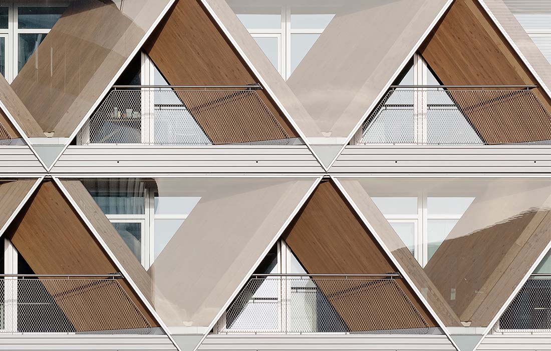 The V-shaped larch columns function as both solar shading and load-bearing structure. The depth of the façade's recesses varies by orientation – to the south and west they form loggias that open the building towards the water. The columns transfer vertical and horizontal loads and interact with the building's concrete core to provide stability. Columns and beams are joined together with connectors in laminated beech veneer.