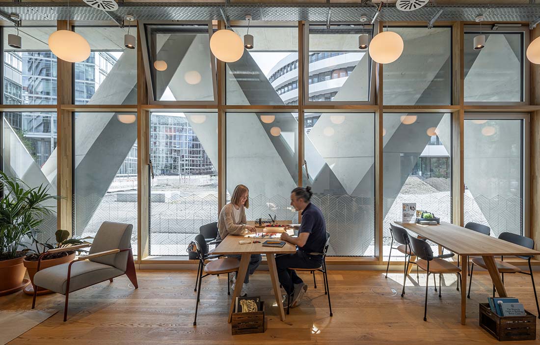 The façade's rhombic structure is more than a decorative skin. Engineering firm Knippershelbig, specialists in structural and façade engineering, developed a design where V- shaped larch columns connect to edge beams via beech connectors, allowing easy disassembly.